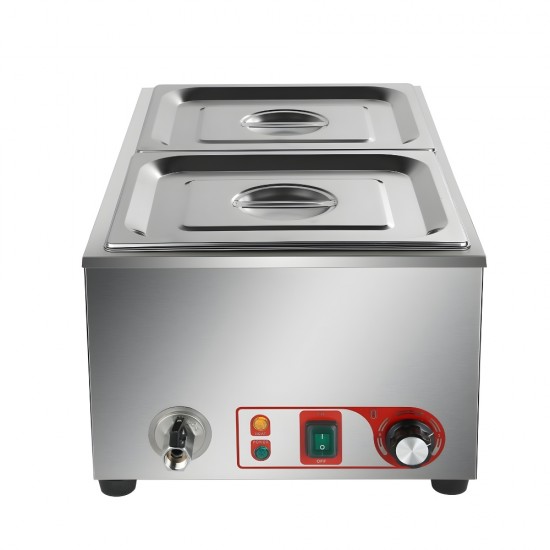 Επαγγελματικό μηχάνημα 'Bain Marie' που ζεσταίνει και συντηρεί τα τρόφιμα σε θερμοκρασία ασφαλή για κατανάλωση. Κατασκευασμένο από ανθεκτικό ανοξείδωτο ατσάλι, ιδανικό για εστιατόρια, ξενοδοχεία, μπουφέ, catering, επαγγελματική εστίαση, εκδηλώσεις, επισιτιστικές μονάδες. Ζεσταίνει τις παρασκευές και τις διατηρεί φρέσκες. Με διακόπτη on-off και θερμοστάτη με εύρος θερμοκρασία 30-85°C. Υψος GN: 15cm. GN 1/2: 325x265mm.Με βρύση νερού.