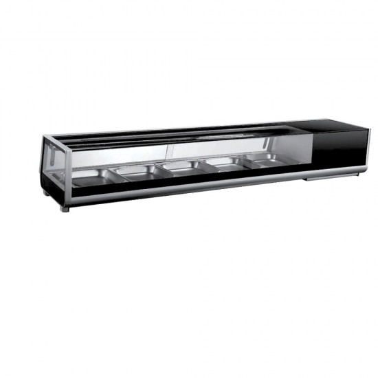 Ψυχόμενη επιτραπέζια βιτρίνα για sushi με 5 θέσεις και φωτισμό LED στην κορυφή. Με ψηφιακό ρυθμιστή θερμοκρασίας με οθόνη και συρόμενες πόρτες. Γυάλινη καμπυλωτή πρόσοψη και εξατμιστής με λεκανάκι στο πάνω μέρος για τη συλλογή συμπυκνωμάτων. Με ψυκτικό υγρό R290 και λεκανάκι 1/3 G/N . Σύστημα άμεσης ψύξης και εύρος θερμοκρασίας 2~12℃.