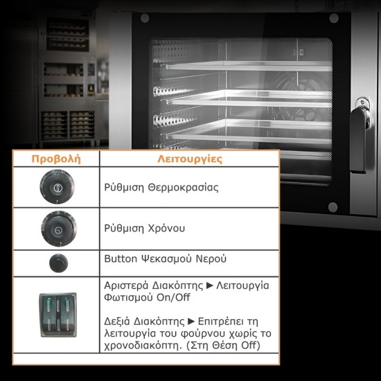 Ο κυκλοθερμικός φούρνος EC 01E είναι κατασκευασμένος από ανοξείδωτο ατσάλι και διάφανη πόρτα με χερούλι. Οι σωλήνες θέρμανσης σε σχήμα U παρέχουν γρήγορη θέρμανση ενώ τα αντιολισθητικά ελαστικά πόδια αποτρέπουν την ολίσθηση. Ο σχεδιασμός με είσοδο νερού και λειτουργία ψεκασμού βοηθάει στην ζύμωση των τροφίμων. Απαγωγή θερμότητας για επιμήκυνση της διάρκειας ζωής του μηχανήματος και κρυστάλλινο ημιδιαφανές γυαλί διπλής στρώσης με μόνωση υψηλής αντοχής για βέλτιστη θερμική απόδοση. Περιλαμβάνει τέσσερα ταψιά 600x400mm και ενσωματωμένο φωτισμό. Με ένα μοτέρ και διακόπτες για ρύθμιση θερμοκρασίας και χρόνου. Εξωτερικές διαστάσεις: 880x800x600mm. Θάλαμος 620x422x448mm.